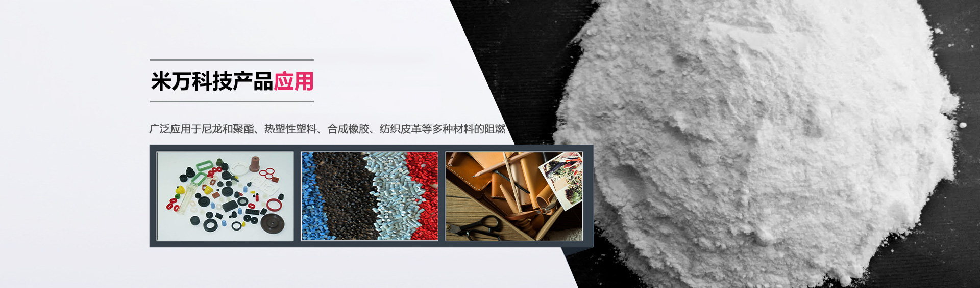 米萬(wàn)科技在橡膠行業(yè)有一系列研發(fā)的阻燃劑產(chǎn)品。產(chǎn)品不含鹵素,由于表面經(jīng)過(guò)改